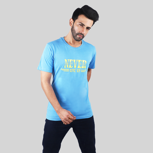 "NEVER GIVE UP" Blue Crew Neck T-Shirt