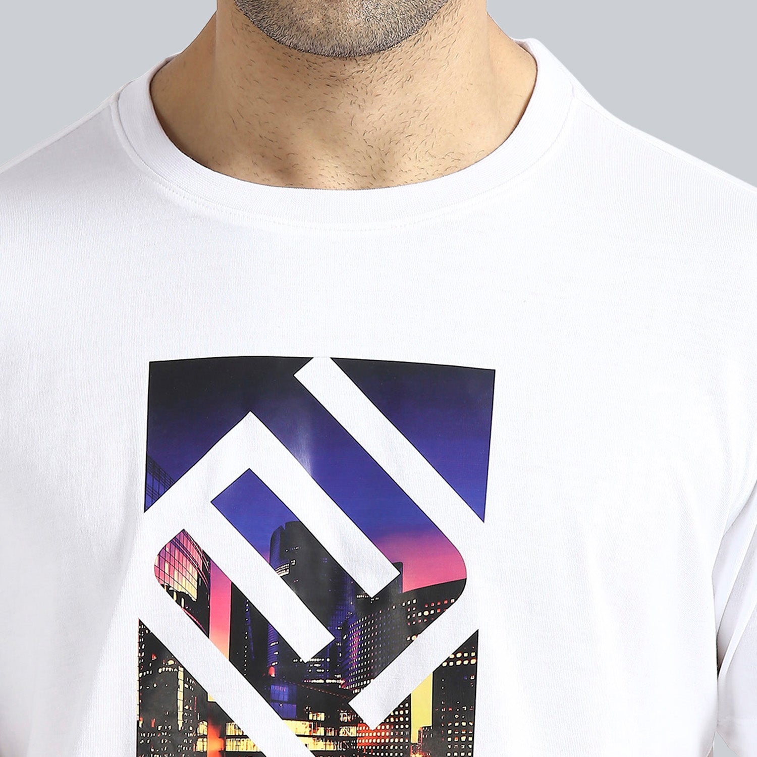 Step up your casual style with this trendy white graphic T-shirt from Elmento. Designed with a modern cityscape print in vibrant colors, overlaid with a bold geometric. Elmento logo, this tee adds a touch of urban edge to your wardrobe. The crisp white cotton fabric makes it versatile and easy to pair with jeans, shorts, or joggers for a relaxed yet fashionable look. Perfect for both day outings and casual evenings, this T-shirt is all about comfort blended with contemporary street style.